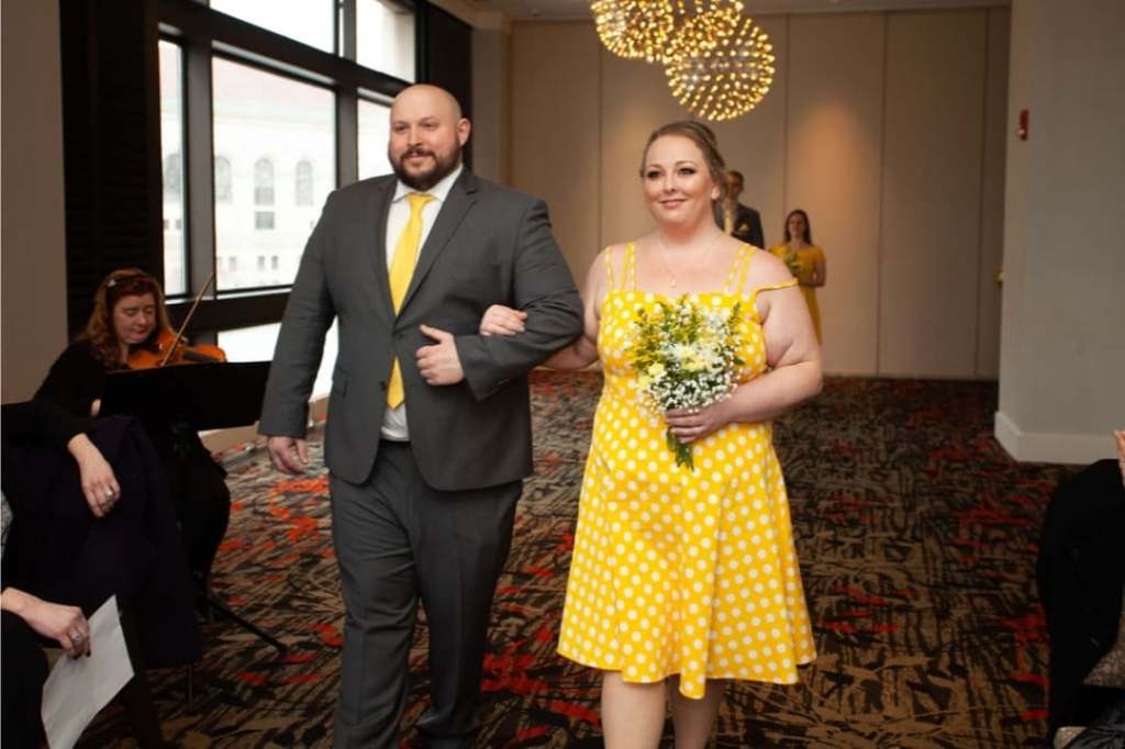 There was so much excitement filling the room, and so much positive energy. Not to mention a lot of good liking people dressed in suits, including my fiance Scott, and my boyfriend David. Soon it was time to make our way down the the Gloucester Room to line up to walk down the aisle. We all grabbed our bouquets, of a beautiful assortment of white and yellow flowers, that Amie’s sister had put together for everyone, and went to the elevators to take us to the spot where Amie and Patrick would become man and wife!