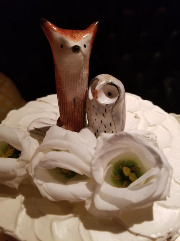 They also made an amazing wedding cake. They brought it out and on top was a little cake topper of an owl and a fox. Amie is the owl, and Patrick is the fox. They are their spirit animals.