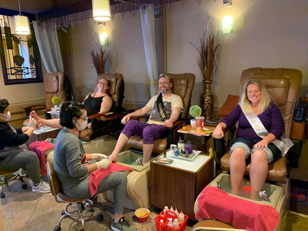 After packing, I started on my adventure for the day. I was meeting up with Amie, Patrick, Amie’s other girlfriend Lily, and her best friend from Virginia at Luminous Nails, where I had made appointments for each of us to get a manicure and pedicure. The staff at the salon went all out for us. They bought us a bottle of Rose, Martinelli’s Sparkling Cider for Patrick, and a fruit platter! They also had congratulations balloons for the bride and groom. It was already starting off as a magical weekend.