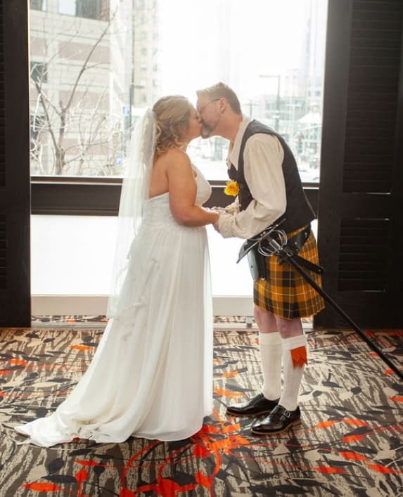 Patrick was beyond handsome. He dressed in his families tartan kilt, complete with flashes and a sporran. To add to the affect of the day, he wore his Dread Pirate Roberts sword, because the big theme surrounding their wedding was “The Princess Bride.” This movie is Amie’s favorite of all time. Patrick proposed to her while they were watching the movie.